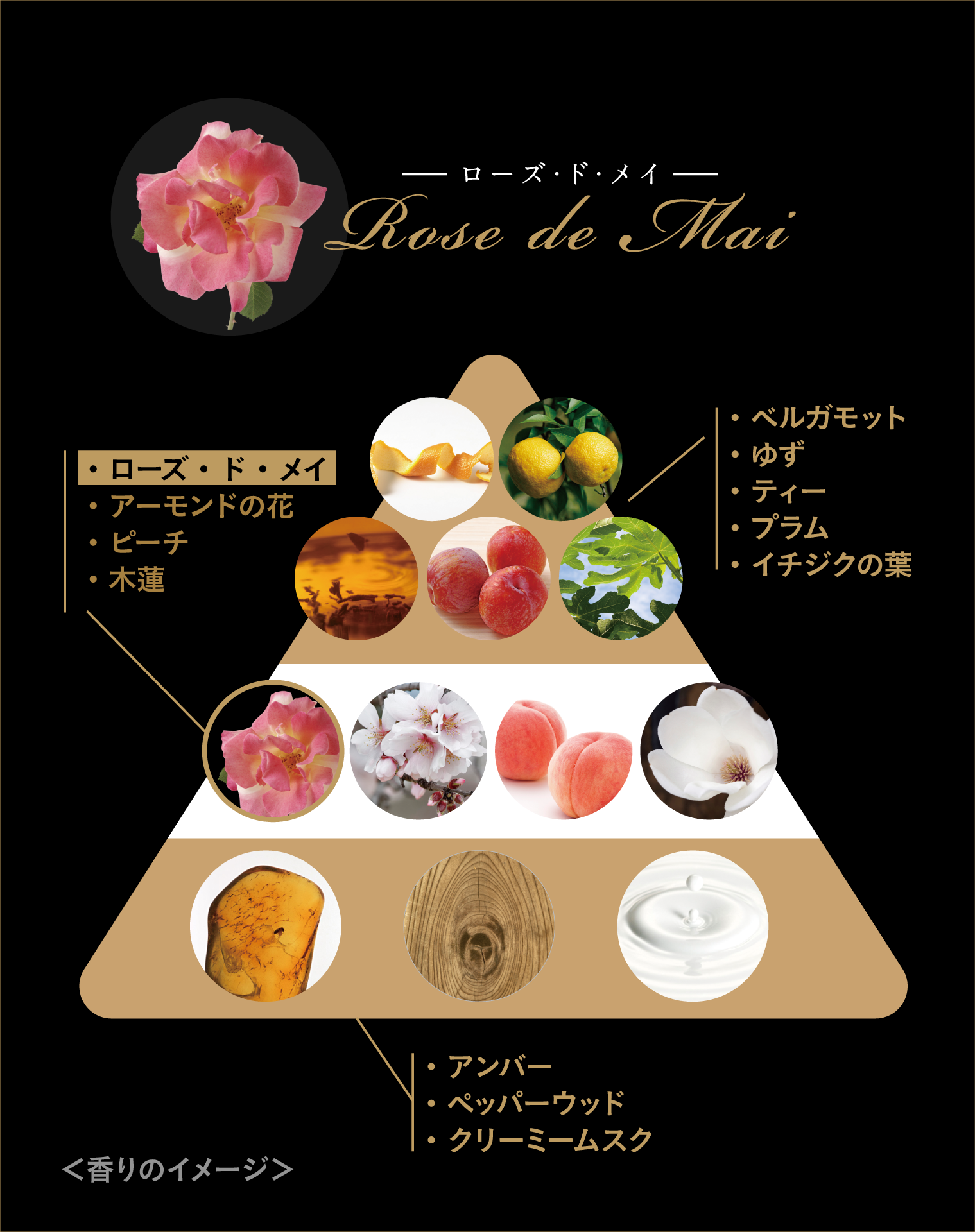 プレミアムスキンケアでも使われている、希少なフランス産ローズ・ド・メイのローズオイルを贅沢に配合した、生命感あふれる、優雅で上質なラクジュアリー・フローラルの香りです。