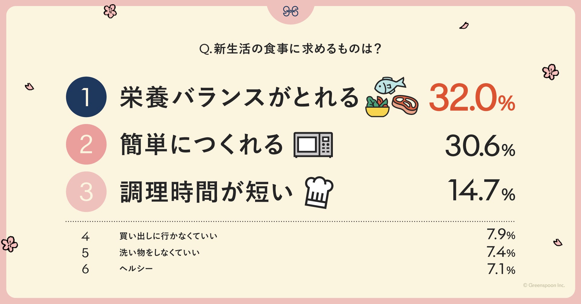 忙しい新生活シーズンの食事で最も求めるものをアンケートしたところ