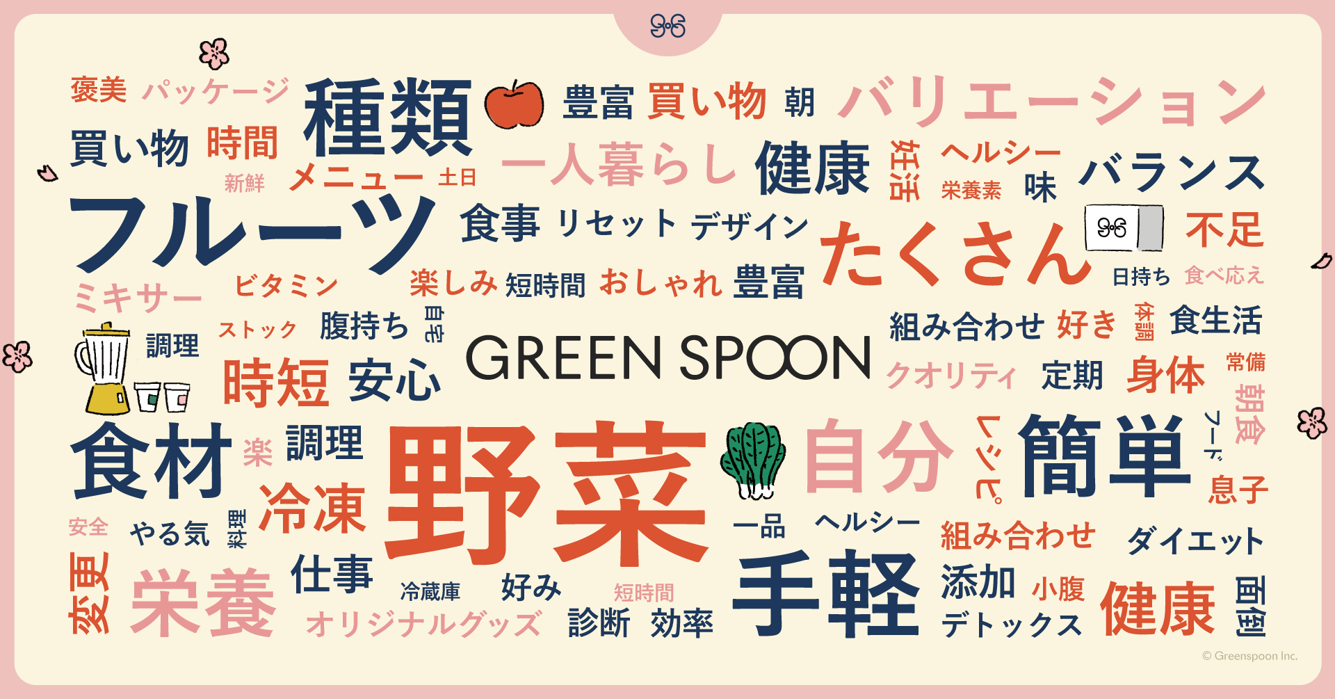 株式会社Greenspoonは、ベジタブル・ワンステップミール「GREEN SPOON(グリーンスプーン) https://green-spoon.jp/ 」の企画・製造・販売を行っております。「GREEN SPOON」では自分のカラダや生活習慣に必要な野菜やフルーツ、ゴロゴロ食材をスムージー、野菜スープ、ホットサラダにしてお届けしています。