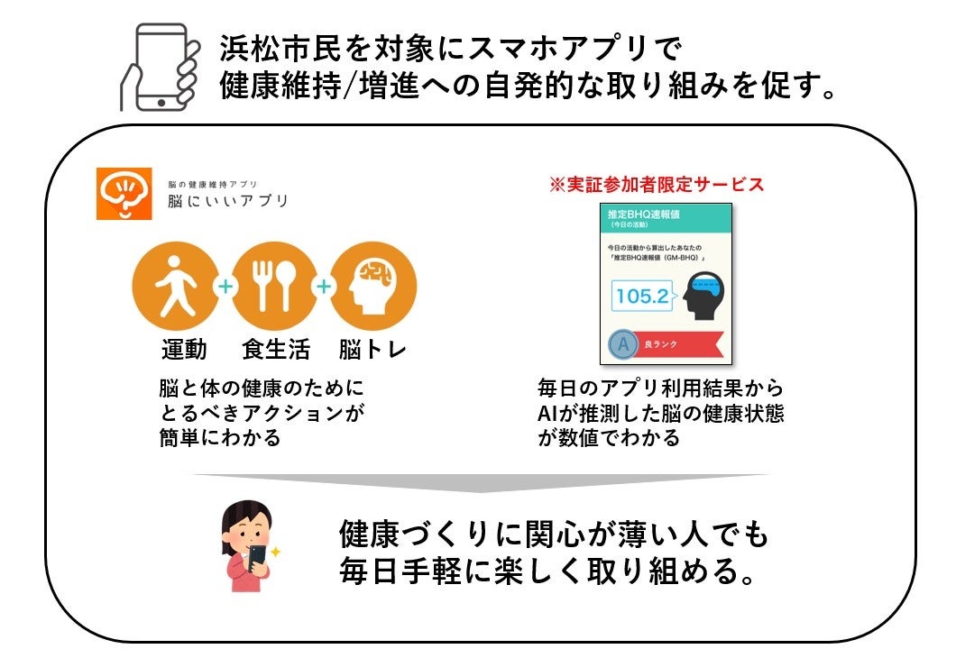 さらに今回の実証では、健康管理に向けた行動促進支援の一つとして、検証実証限定サービスである「推定BHQサービス」を参加者限定で無償提供いたします。推定BHQサービスでは、毎日のアプリの利用結果からAIが測定し数値化された脳の健康レベル(BHQ)*1の推定値を知ることができ、日々の健康づくりにより楽しみながら取り組めます。