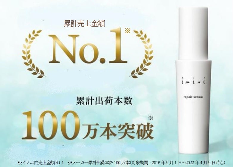 スキンケアやメイク、健康食品などを展開するブランド「imini(イミニ)」は、LPS素材のパイオニアである自然免疫応用技研(株)との共同開発により「免疫力」に着目した様々な商品をラインナップしています。中でも今回100万本を突破した「リペアセラム」は、2015年の発売以来多くのお客様の肌悩みに寄り添ってきました。日本初の原料【LPS スーパー®100※2】を配合し、年齢肌に必要なケアが1本で完了するシリーズ内売上NO.1※3アイテムです。