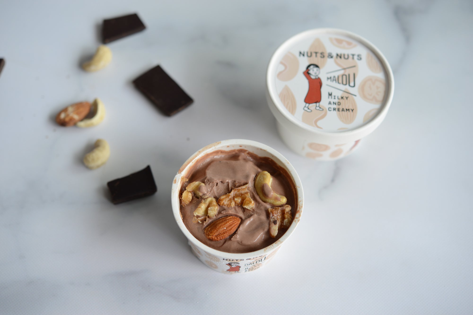 濃厚なチョコレートアイスに、アーモンドとカシューナッツ、クルミがたっぷり。底のほうにも忍ばせたナッツで、最後まで満足感が続きます。