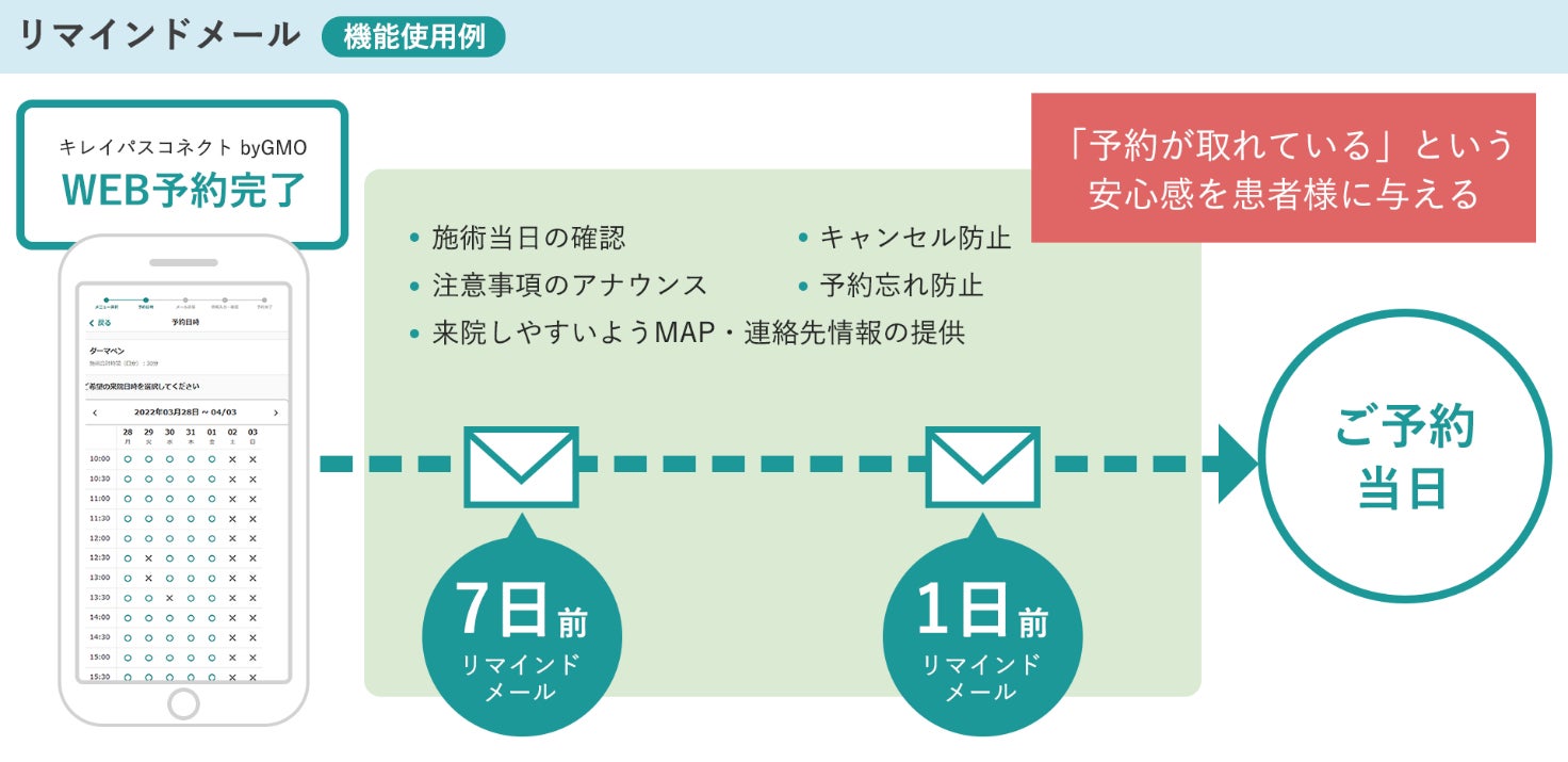 「キレイパスコネクトbyGMO」のWEB予約システム経由で予約をされた患者様に対して、ご予約日当日までの期間、美容クリニックにとって任意のタイミングでリマインドメールを自動送信することが可能となります。なお、リマインドメールの内容については、当日の施術内容や注意事項、MAP情報、連絡先などを自由にカスタマイズしてご利用いただけます。本機能により、直前のキャンセルや予約忘れの防止のみならず、予約をされた患者様に対して「しっかりと予約が取れている」という安心感を抱いていただく効果も期待できます。