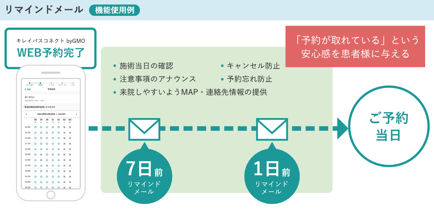 「キレイパスコネクトbyGMO」のWEB予約システム経由で予約をされた患者様に対して、ご予約日当日までの期間、美容クリニックにとって任意のタイミングでリマインドメールを自動送信することが可能となります。なお、リマインドメールの内容については、当日の施術内容や注意事項、MAP情報、連絡先などを自由にカスタマイズしてご利用いただけます。本機能により、直前のキャンセルや予約忘れの防止のみならず、予約をされた患者様に対して「しっかりと予約が取れている」という安心感を抱いていただく効果も期待できます。