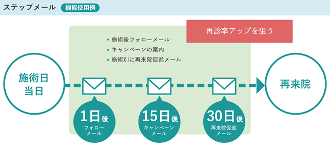 施術完了日より施術毎にステップメールの自動配信を行えます。施術後のフォローメールの自動化・施術別のキャンペーンのアナウンス・再来院の促進メール等、再診率をアップさせるための各美容クリニックに適したメールマーケティングの仕組化が可能です。