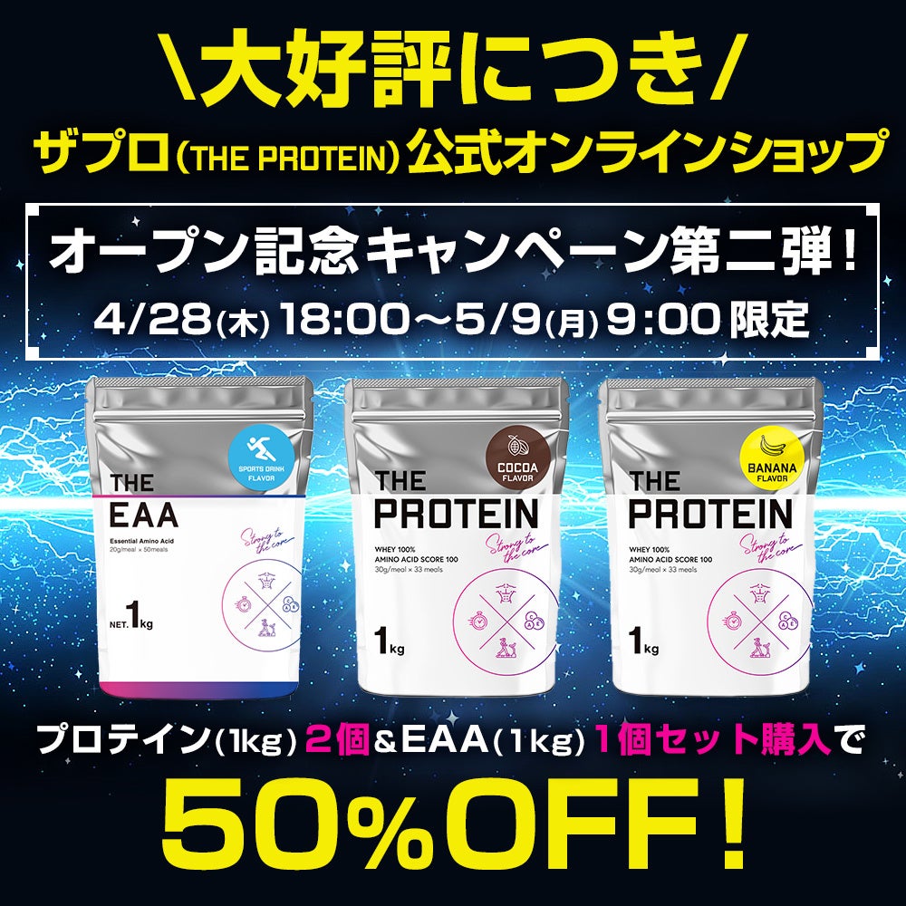 武内製薬ザプロ(THE PROTEIN)1kg×2個・武内製薬 THE EAA 1kgが期間中、通常販売価格から50%OFFで販売いたします。