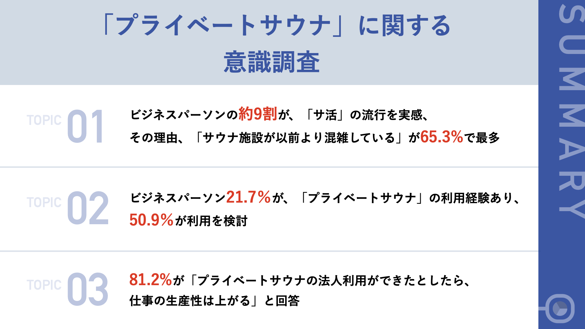 今回の調査により、半数以上からサウナ及びサウナ施設を「静かに利用したい」という声が上がったものの、近年の「サ活」の流行で、ビジネスパーソンが求めるサウナ施設が以前より混雑しており、利用が難しくなっている現状が垣間見えました。そのため、静かで快適に過ごすことのできるプライベートサウナを利用、検討するサウナーが多数見受けられました。そのような中で、約8割のサウナーから完全会員制のプライベート・高級サウナが福利厚生として法人利用できたら、仕事の生産性が上がるという声が上がったことからも、完全会員制のプライベート・高級サウナを福利厚生として法人契約することは、企業にとっても社員にとっても有益であると言えるのではないのでしょうか。