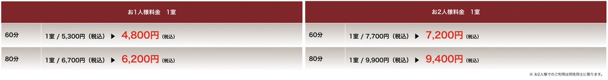 60分)1人用:30,000円、2人用:45,000円 / 80分)1人用:40,000円、2人用:60,000円