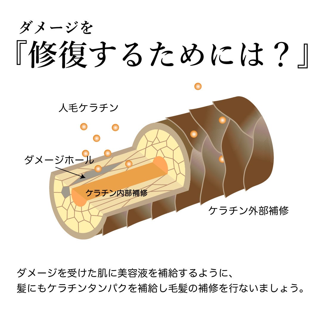 髪の成分の80%がケラチンです。髪はダメージが進むと、ケラチンが不足してスカスカになってしまいます。