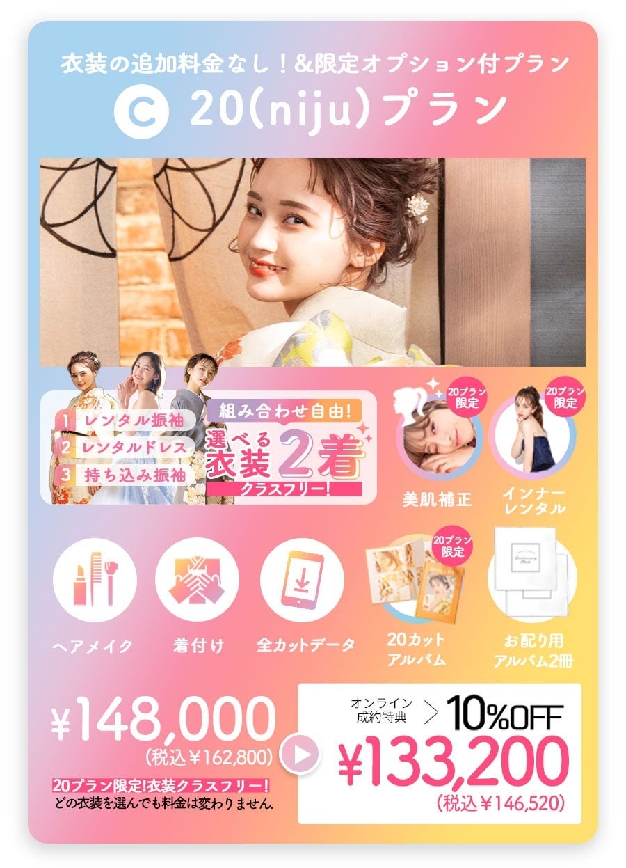 お好きな衣装を当日の成人式と前撮り時にお選びいただける特別プランとなっております。