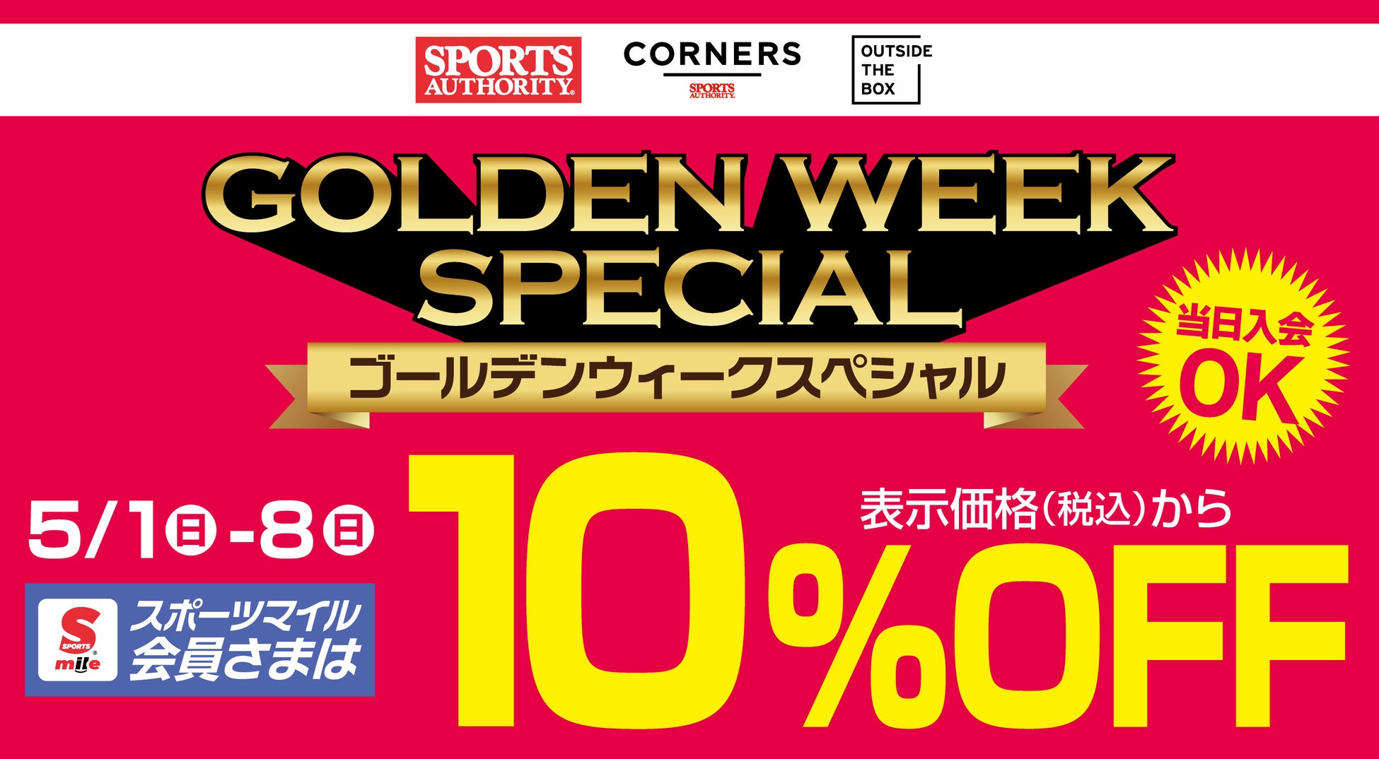 この度、ゴールデンウィークのお買いものをお得に楽しんでいただくために、当社が運営する「スポーツオーソリティ」をはじめ、「CORNERS」、「OUTSIDE THE BOX」店舗と各直営ECサイトにて、スポーツマイル会員さまのお買いものが10%OFFとなるスペシャルキャンペーンを実施致します。当日のご入会も割引対象となりますので、是非この機会にお買い求めください。