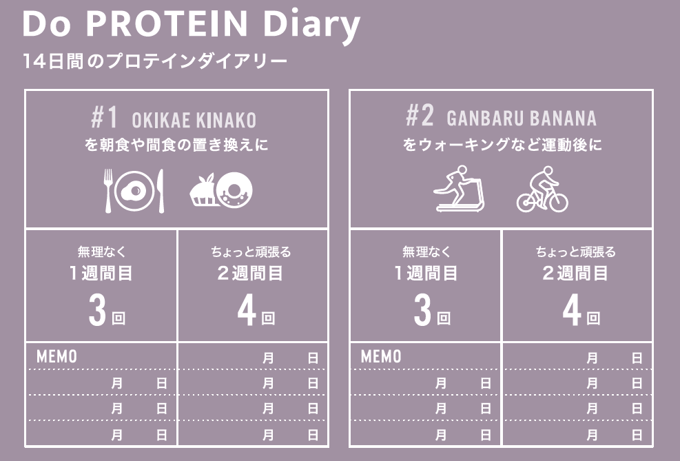 ①置き換えにオススメの「#1 OKIKAE KINAKO」と、運動後にオススメの「#2 GANBARU BANANA」の2種類展開。ご自身の目標に合わせて選べます。