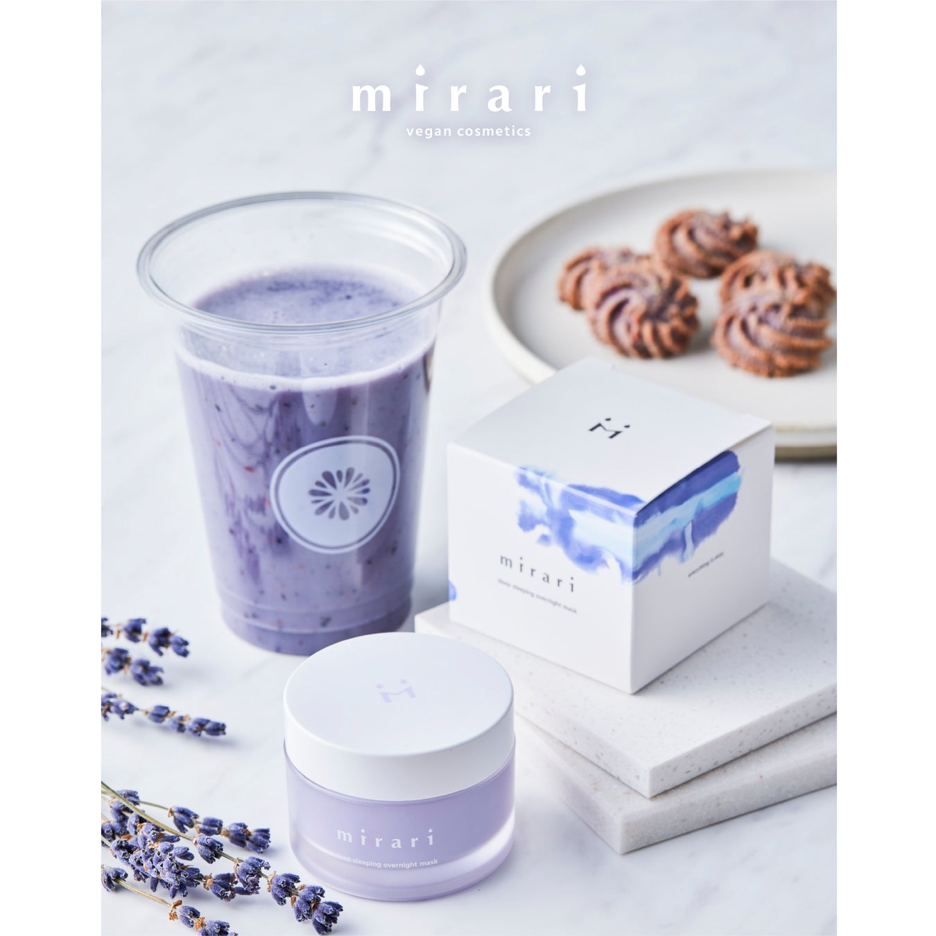 寝ている間に肌を浄化する洗い流し不要のスリーピングマスク「mirari deep sleeping overnight mask」とともに、身体にも肌にも良い成分にこだわった「Relax Purple Smoothie」、「Lavender Vegan Cookies」で自分を愛する素敵な時間になりますように。