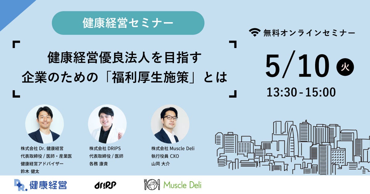 マウスピース矯正hanaravi(ハナラビ)を運営する株式会社DRIPS(本社:東京都千代田区、代表:各務康貴)は予防医療の啓発のため、Dr.健康経営(本社:東京都渋谷区、代表:鈴木健太、以下)、ダイエットやボディメイクを食でサポートする株式会社Muscle Deli(本社:東京都渋谷区、代表:西川真梨子)と5月10日(火)13:30~より、三社共催で健康経営に取り組んでいる企業を対象としたオンラインセミナー『【健康経営セミナー】健康経営優良法人を目指す企業のための「福利厚生施策」とは』を開催いたします。