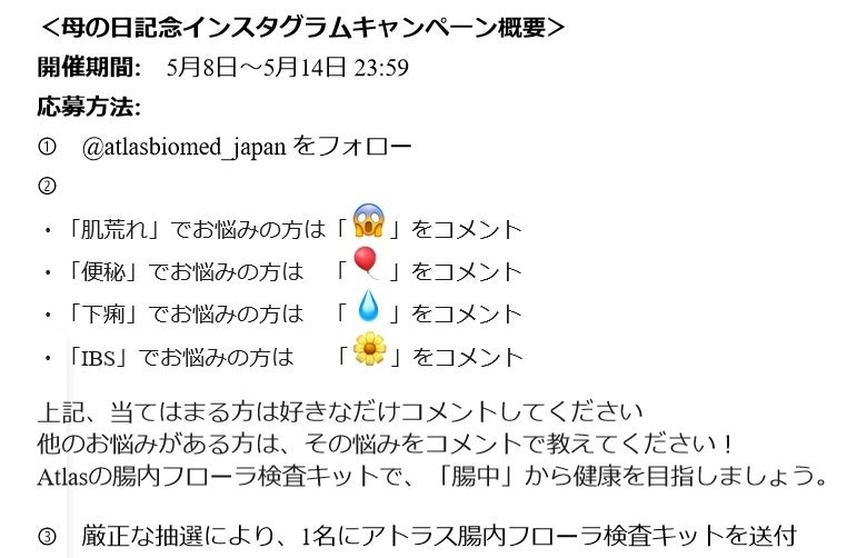 アトラスジャパンは、母の日を記念して5月8日〜5月14日 にインスタグラムのキャンペーンを実施します。インスタグラムでご自身の「お悩み」に関するアンケートに回答するだけで抽選で1名様にアトラス腸内フローラ検査キットをプレゼントします。