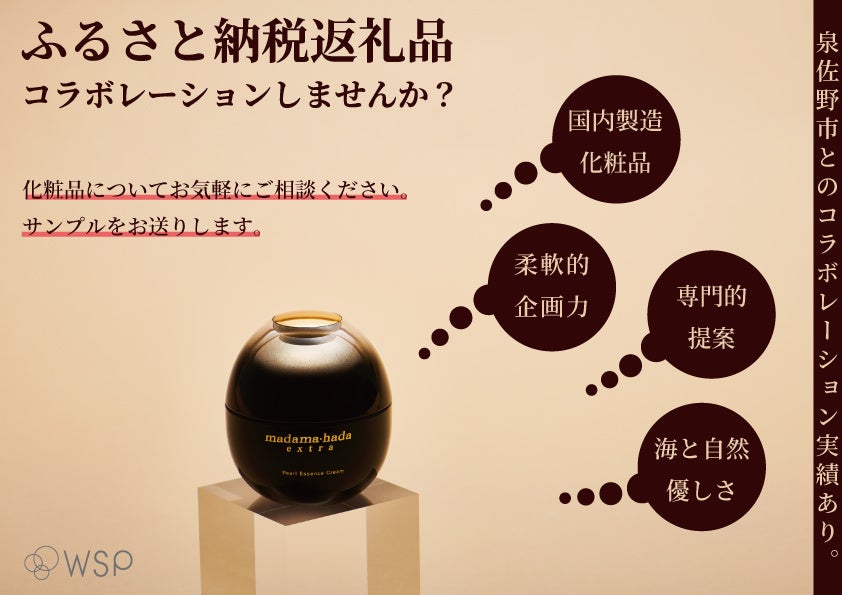 株式会社WSP[ダブルエスピー](本社所在地:東京都中央区、代表取締役社長:渡邊 雅夫)は、真珠貝(アコヤ貝)から抽出される真珠成分(加水分解コンキオリン)を配合した基礎化粧品の企画・製造・販売を行い、「真珠美容」を発信している会社です。私たちの製品にご興味をもって頂いた自治体・事業所様へ特別に化粧品サンプルをお送りいたします。※数に限りがございます。