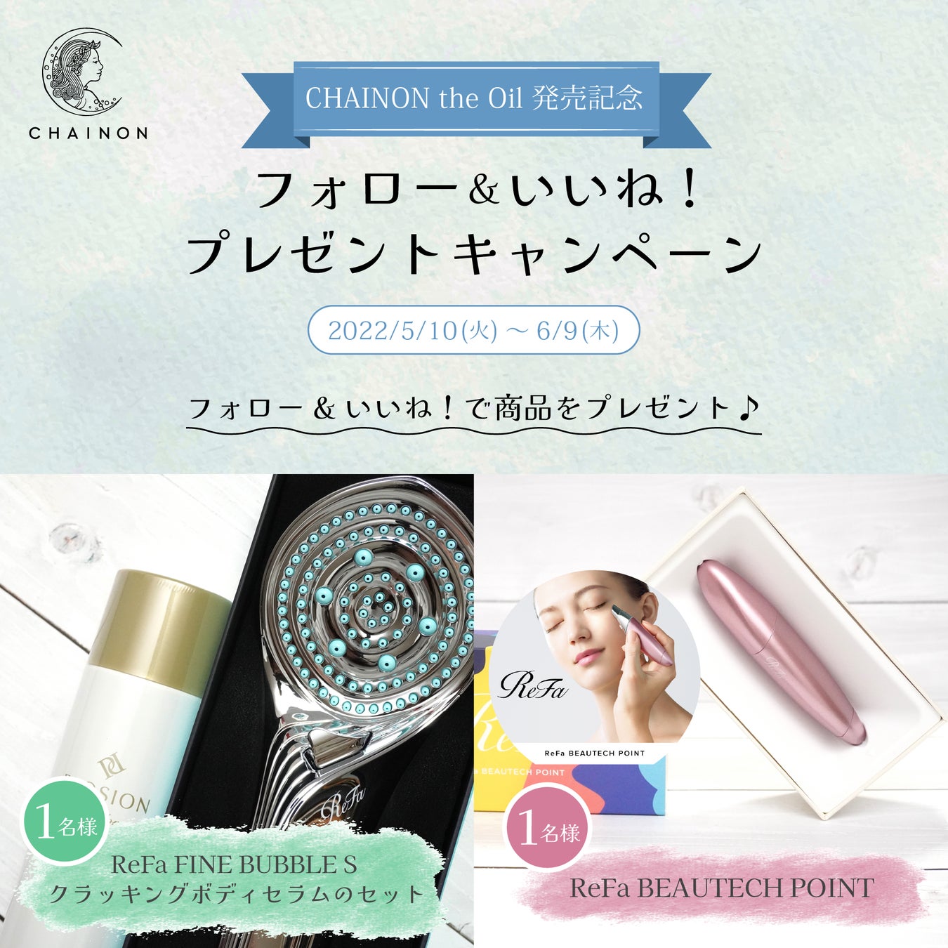 ヘアオイル発売を記念して、5月9日(月)から6月8日(水)までのキャンペーン期間中に、CHAINON(シェノン)公式Instagarmアカウント(@chainon_umegaoka)をフォローし、対象の投稿に「いいね!」をした方の中から抽選で2名に、豪華美容器具をプレゼントするキャンペーンを開始しました。