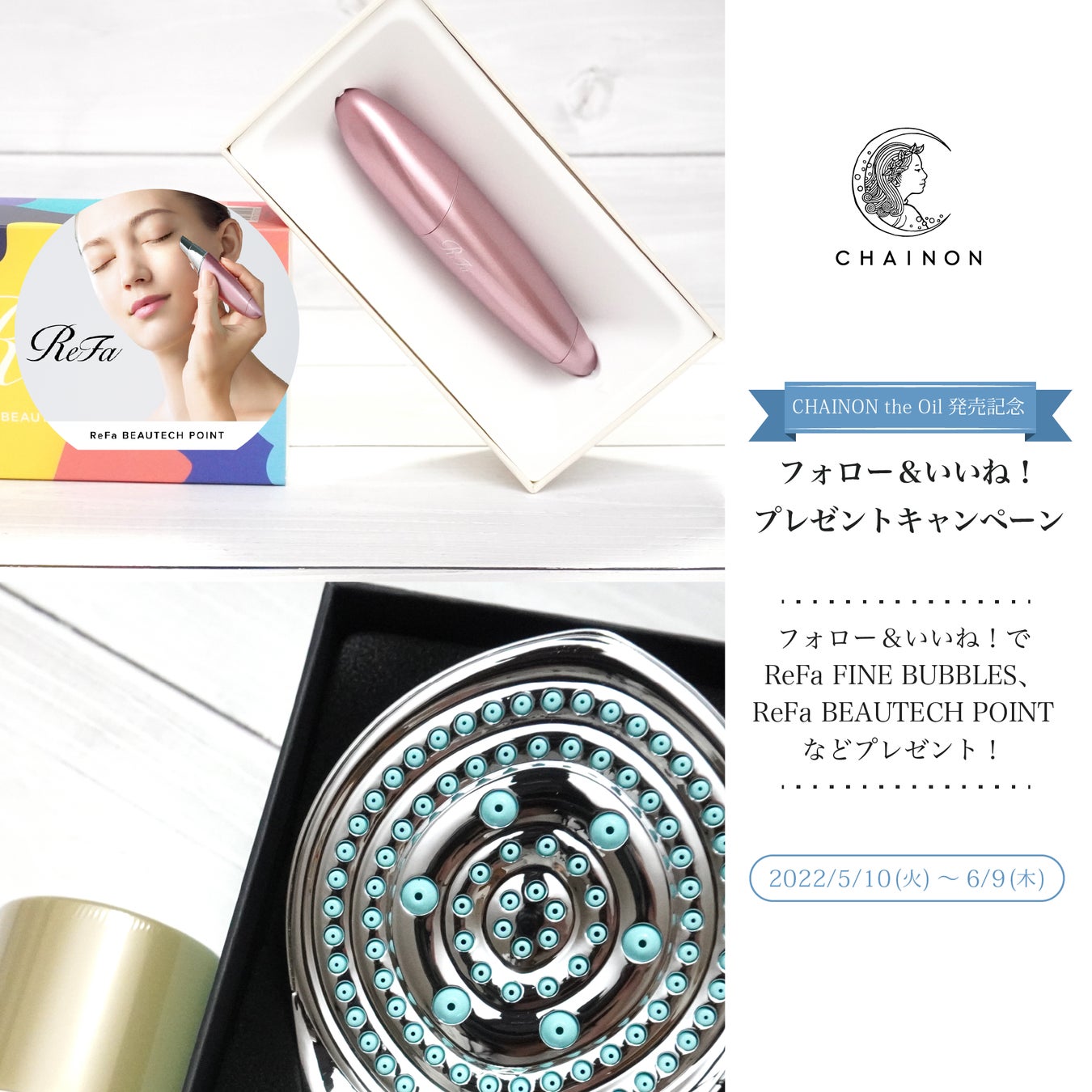 5月9日(月)から6月8日(水)までのキャンペーン期間中に、CHAINON(シェノン)公式アカウント(@chainon_umegaoka)をフォローし、対象の投稿に「いいね!」をした方の中から抽選で「ReFa FINE BUBBLE S & クラッキングボディセラムセット」「ReFa BEAUTECH POINT」がそれぞれ1名様に当たる!