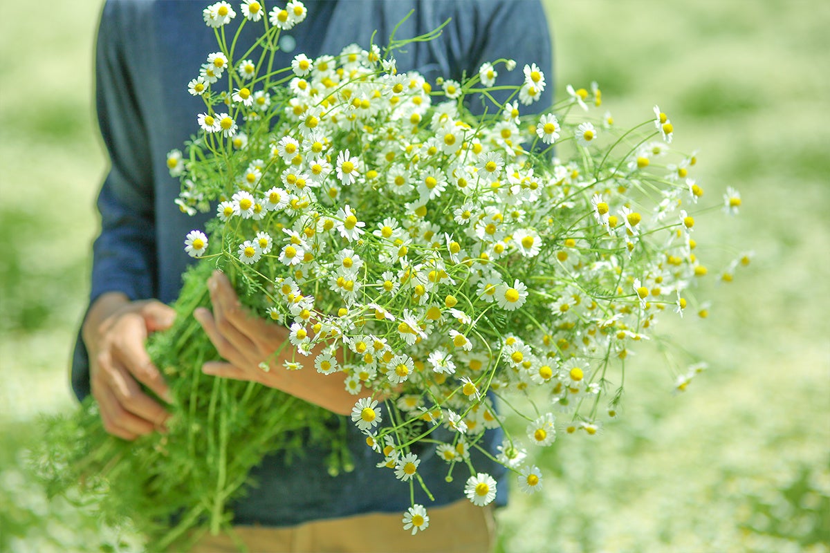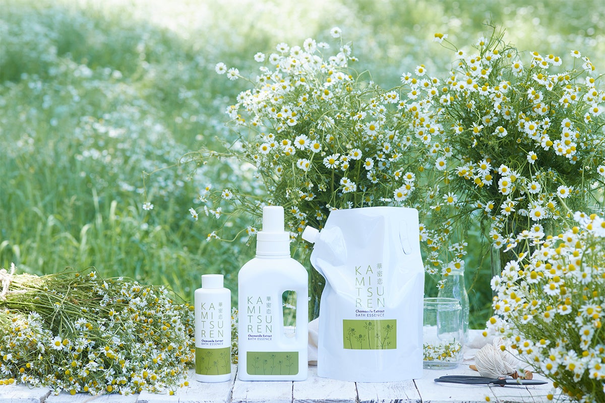 カミツレエキスの原料となるカモミールは、自社農園や国内の契約農家で、農薬を使わず有機肥料で栽培し、カモミールの全草(花・葉・茎)から、独自の非加熱製法で約30日かけてじっくりとエキスを抽出。カミツレエキス100%の華密恋薬用入浴剤は、1982年の発売以来、40年にわたり愛され続けるロングセラー商品です。