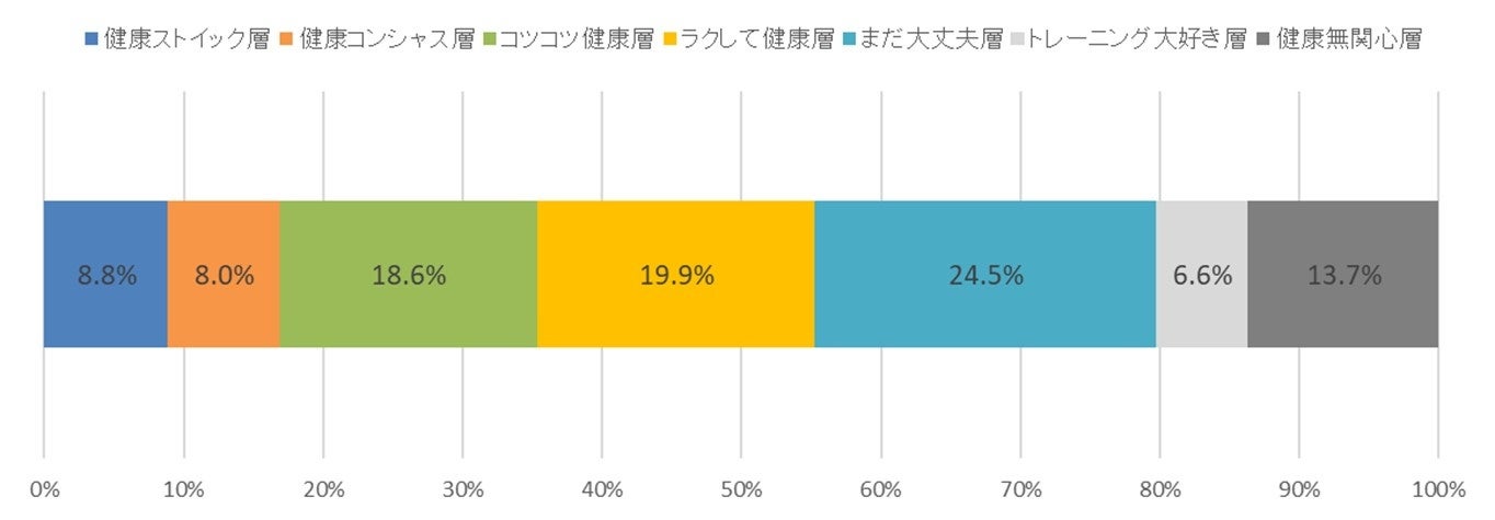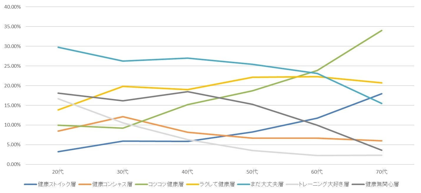 「コツコツ健康層」と「健康ストイック層」は年代が高くなるにつれて構成比が上がっていく一方で、「まだ大丈夫層」、「健康無関心層」、「トレーニング大好き層」は年代が高くなるにつれて構成比が下がっており、健康意識が60代を境に大きく変化している。