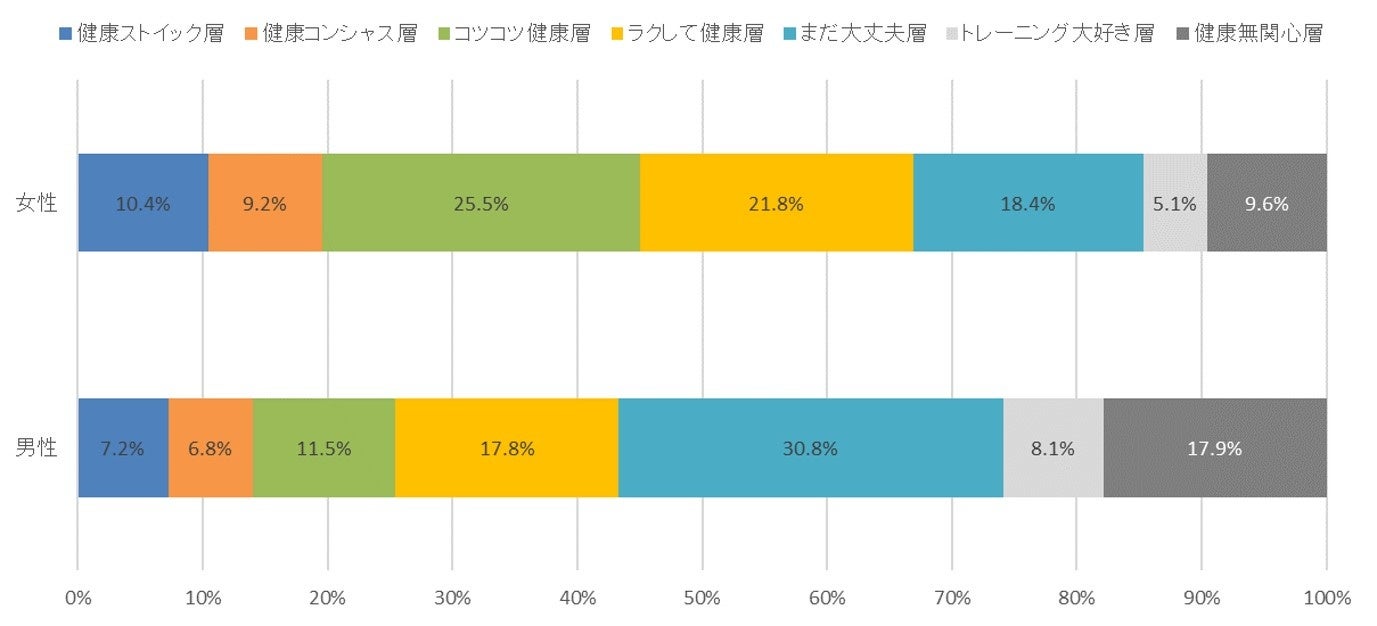 健康に対して、何らかの意識があるセグメント層は全体の61.8%であったが、性別で見てみると、女性の約7割が健康に対して何らかの意識がある一方、男性は「まだ大丈夫層」「健康無関心層」の両者で約5割を占めており、健康に対しての意識が低い。
