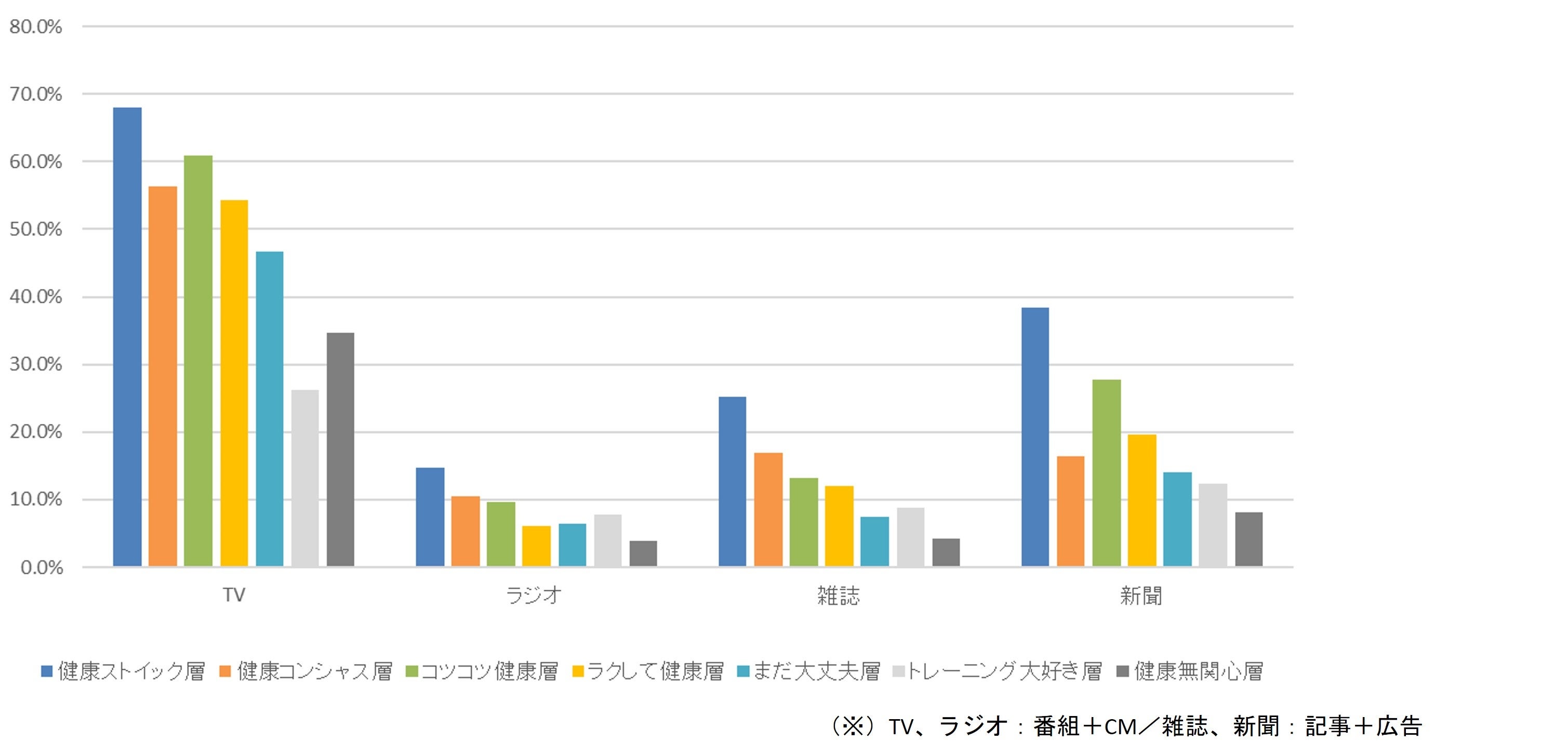 また、デジタル領域においての情報源でも、健康セグメントによって異なる傾向がみられる。健康意識が高く健康情報源ではほぼ同じ「健康ストイック層」と「健康コンシャス層」だが、普段アクセスしているデジタルメディアには違いがあることが伺えた。