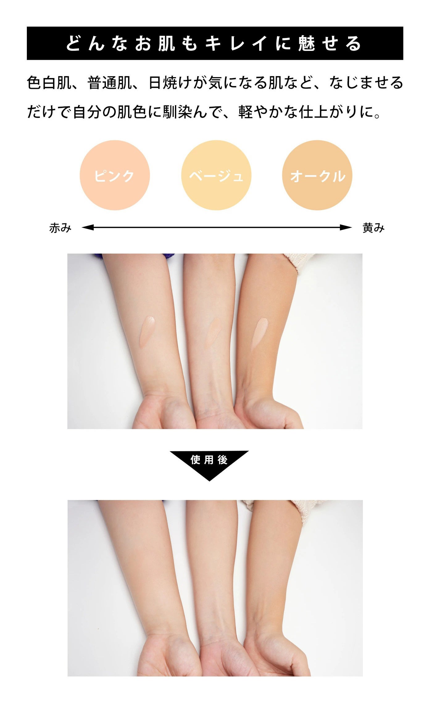 軽いつけ心地で肌なじみも抜群。すっと薄く伸びて毛穴やシミ、細かいシワまで気になる部分をしっかりカバーしながら、なめらかでほんのり輝くツヤ肌にしてくれます。潤いを保ちながらベタつかない肌を長時間キープ、皮脂や汗などの老廃物によるベタつきや崩れを気にせずに一日中キレイな状態を保つことができます。