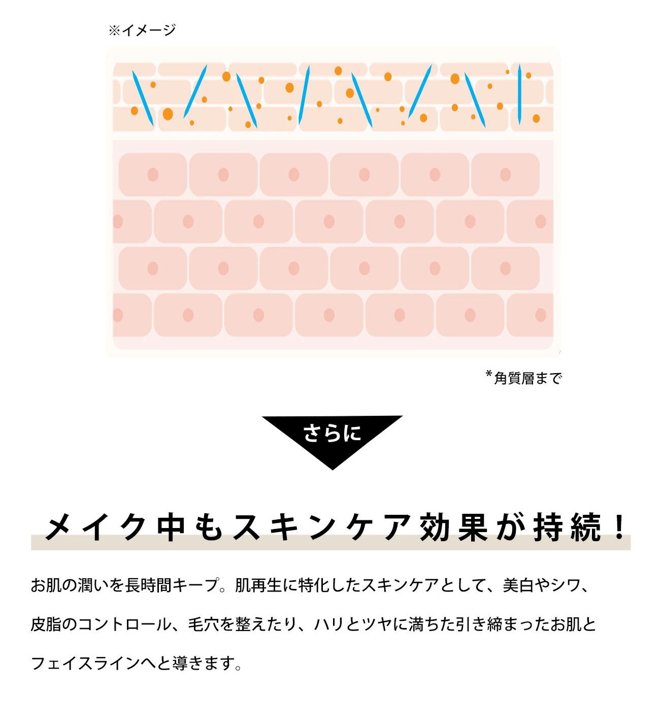 ※スピキュールは角質層に留まるため、体内に入り込むことはありません。角質層の細胞が生まれ変わり排出されるまでの間、肌を適度に刺激して美容成分が肌に浸透します。