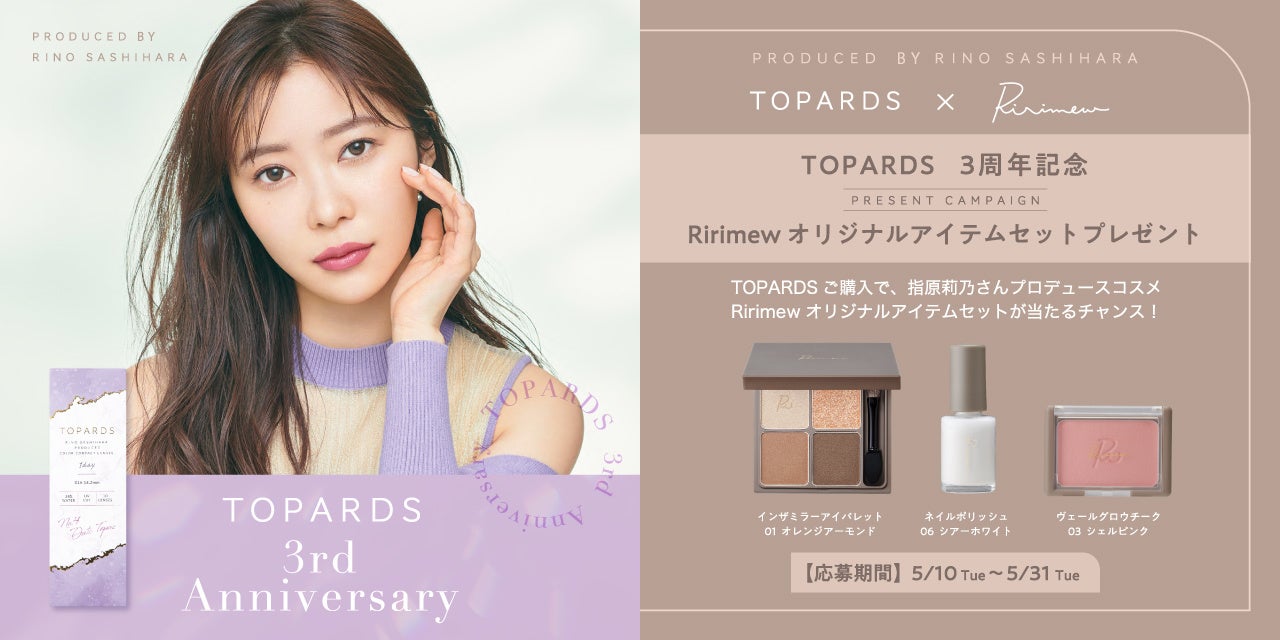 PIA株式会社(本社:東京都品川区 代表取締役:中西 聖)は、指原莉乃さんプロデュースのカラーコンタクトレンズブランド『TOPARDS(トパーズ)』3周年を記念した特別企画を実施いたします。本日5月10日(火)より、『TOPARDS』ご購入で大人気の指原莉乃さんプロデュースコスメ『Ririmew』オリジナルアイテムセットが当たるキャンペーンを実施いたします。