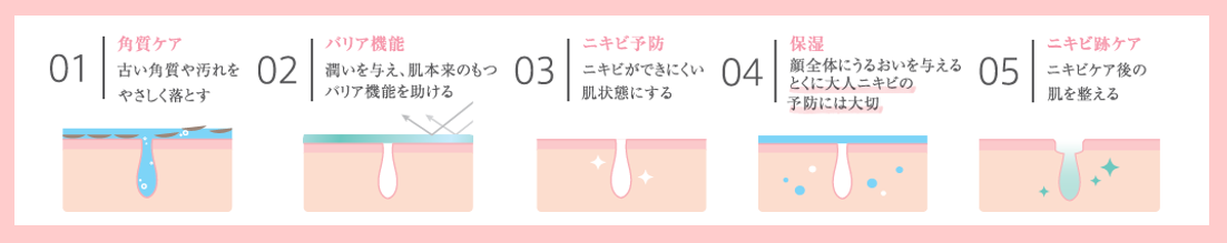 しっとりうるおう使用感と、たっぷりとした美容成分を配合。化粧水と美容液のはたらきを兼ね備えたエッセンスです。肌本来のバリア機能をやさしく助け、ニキビができにくい状態を保ちます。