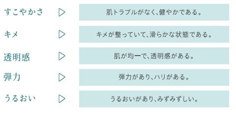 美しい素肌は「すこやかさ」「キメ」「透明感」「弾力」「うるおい」が整っています。