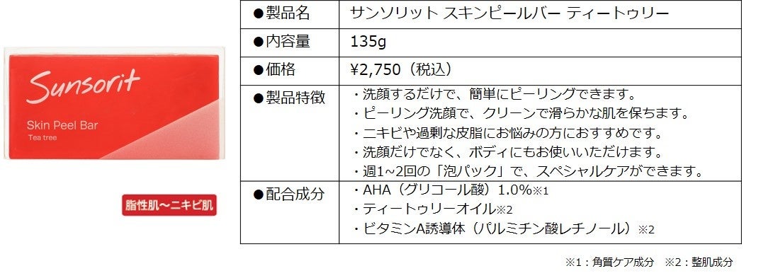 株式会社サンソリット(所在地:東京都港区 代表取締役社長:村田 徳彦) は、ニキビ向けスキンケアシリーズ「ACクリアシリーズ」を5月10日(火)に新発売いたします。本シリーズは、不安定なお肌をやさしく整えながら、ニキビ予防~気になるニキビケア後までをトータルケアする2アイテムです。ニキビを繰り返させず、健やかな美しい素肌を引き出すためのスキンケアシリーズです。また医療機関で長年愛されている、ピーリング石鹸「スキンピールバー」をお届けするサンソリットだからこそできた、ニキビ向けスキンケアシリーズをご提案いたします。