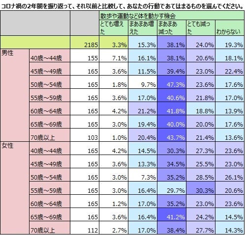 当社が3月7日から13日に行った調査(インターネット調査 n=2,185 40歳~70歳以上 男性:1,083名 女性:1,102名)では、40歳以上の男女のうち、コロナ禍で「散歩などの外出や、身体を動かすことが減った」と答えている人が、62.1%(とても減った 24.0%/まあまあ減った 38.1%)で、6割を超えています。また、「健康に自信がありますか」という質問では、「自信がない」と答えた人が、63.4%(全く自信がない 13.3% あまり自信がない 50.1%)と、こちらも6割を超える人が「自信がない」と答えています。また、「体力に自信がありますか」という質問には、「自信がない」と答えた人が69.5%(全く自信がない 17.3% あまり自信がない 52.2%)で、約7割の人が、体力に自信がないようです。(詳細は、4月7日発表 ニュースリリースタイトル「コロナ禍で『対面の会話が減った』中高年、8割超」。)特に40代女性は、「健康に全く自信がない」とこたえているのも、「体力に全く自信がない」と答えているのも、2割を超え、他の年齢層よりも群を抜いています。