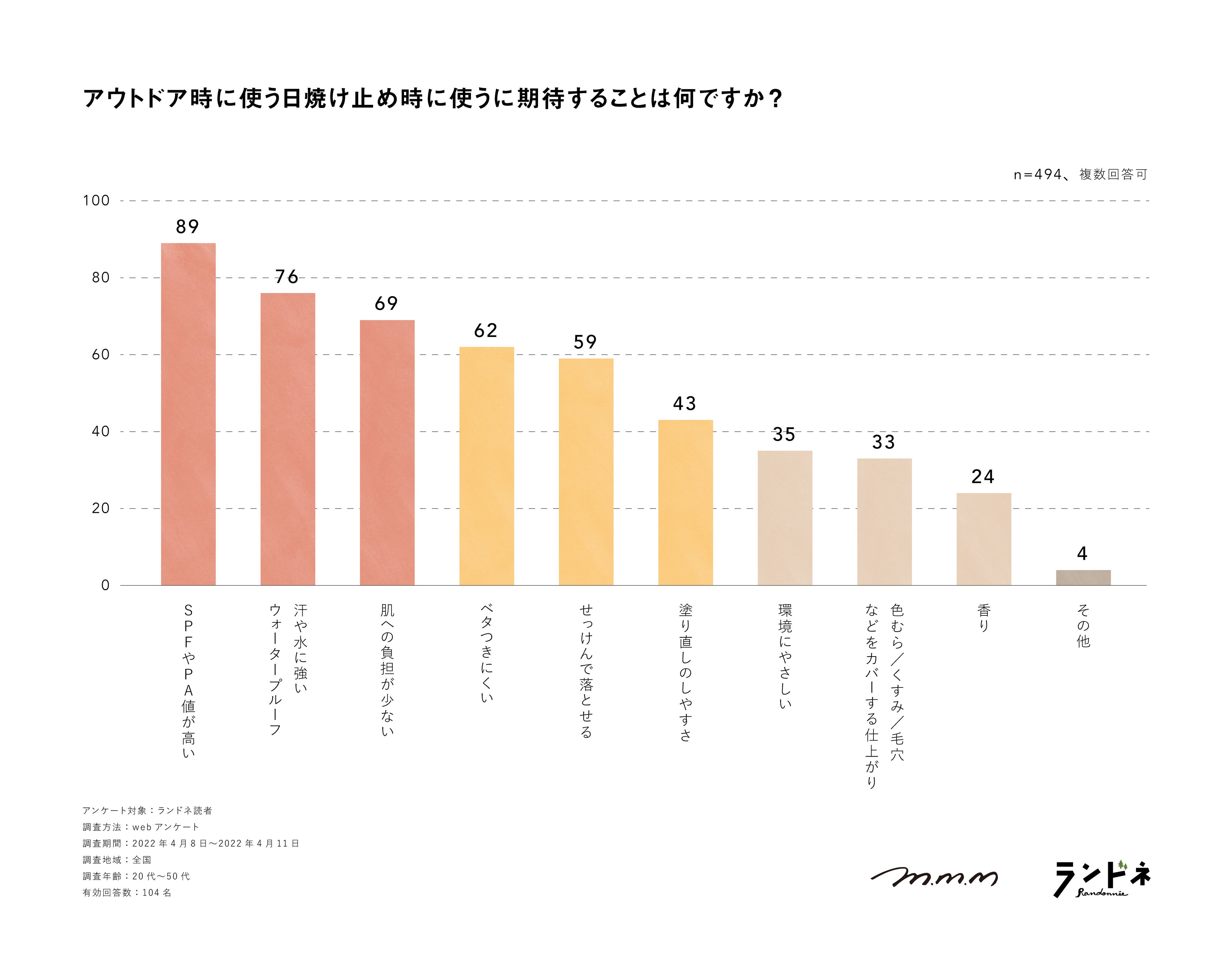 「アウトドア時に使う日焼け止めに期待することは何ですか?」という質問では、76%が「ウォータープルーフ」と回答。次いで「肌負担が少ない」「ベタつきにくい」「石けんで落とせる」ことに期待する人が60%前後という結果でした。