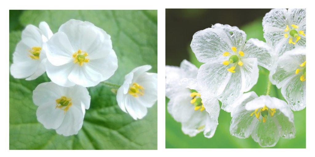 高山植物であるサンカヨウ(山荷葉)は、長雨が降り続くと細胞のすみずみまで水を染み渡らせ、ガラス細工のように透明で神秘的な姿に変化する植物です。
