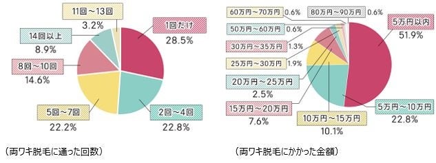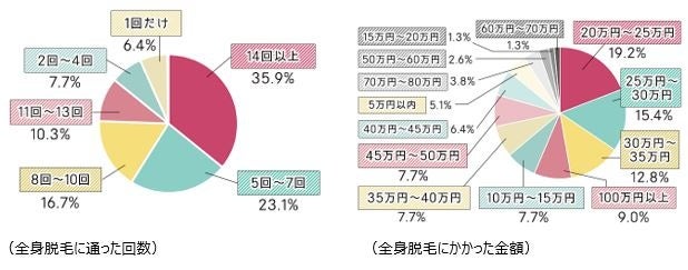全身脱毛に関しては、14回以上と答えた人が35.6%と最多で、5回~7回が23.1%、8回~10回が16.7%という回答も多い。予算は20万円台が19.2%と多いが、100万円以上かけた人も9.0%と1割弱いることが明らかになった。