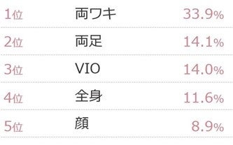 施術をした部位は、両ワキが33.9%、続いて両足14.1%、VIO(デリケートゾーン)14.0%、全身11.6%、顔8.9%と、ワキ脱毛が最も多いことが分かった。