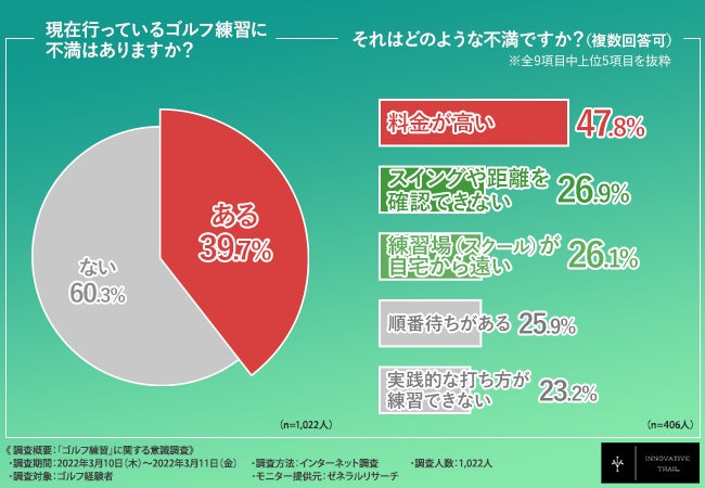 「現在行っているゴルフ練習に不満はありますか?」と質問したところ、『ある(39.7%)』『ない(60.3%)』という結果になり、4割近くの方が何らかの不満を抱いている様子が窺えます。