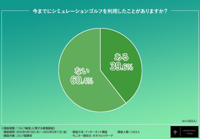 そこで、「今までにシミュレーションゴルフを利用したことがありますか?」と質問したところ、『ある(39.6%)』『ない(60.4%)』という結果になりました。