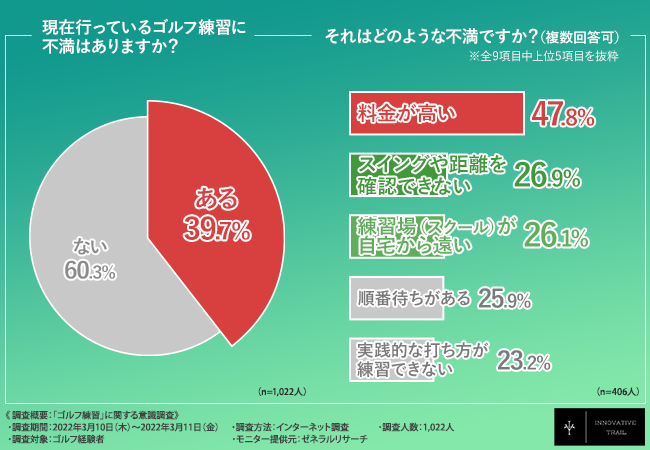 より上達したい、本格的にゴルフトレーニングを行いたいとなると、通う頻度が増える分さらに費用や時間の面で負担は増え、抱える不満も増えてくるでしょう。