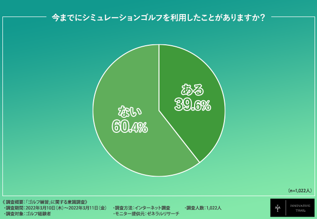そこで、「今までにシミュレーションゴルフを利用したことがありますか?」と質問したところ、『ある(39.6%)』『ない(60.4%)』という結果になりました。