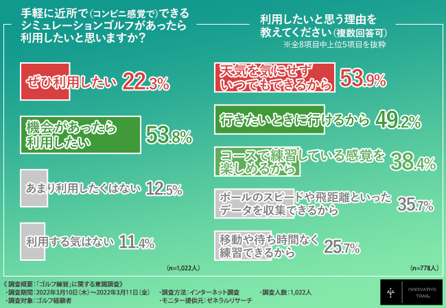 そこで、「手軽に近所で(コンビニ感覚で)できるシミュレーションゴルフがあったら利用したいと思いますか?」と質問したところ、『ぜひ利用したい(22.3%)』『機会があったら利用したい(53.8%)』と7割以上の方が前向きな回答でした。