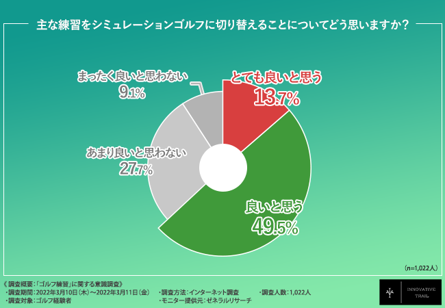 そこで、「主な練習をシミュレーションゴルフに切り替えることについてどう思いますか?」と質問したところ、『とても良いと思う(13.7%)』『良いと思う(49.5%)』と6割以上の方が良いと回答しました。
