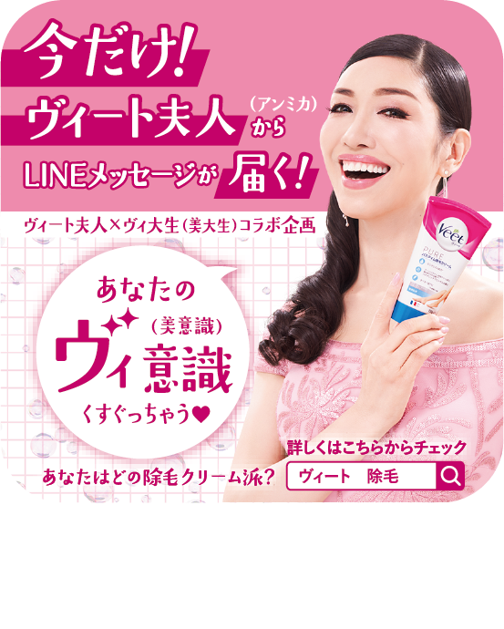 対象商品である「ヴィート PURE バスタイム除毛クリーム 敏感肌用」を購入した方限定で、商品についているアテンションステッカーに記載されたQRコードから”ヴィート夫人”とLINEで友達になることができます。友達登録後、期間中に合計24回”ヴィート夫人”から”ヴィ意識(美意識)”をくすぐるポジティブメッセージやユニークな格言が送られます。あわせて、”ヴィ大生(美大生)”がデザインした、思わずシェアしたくなるオシャレなイラストがあなたの元へ届きます。