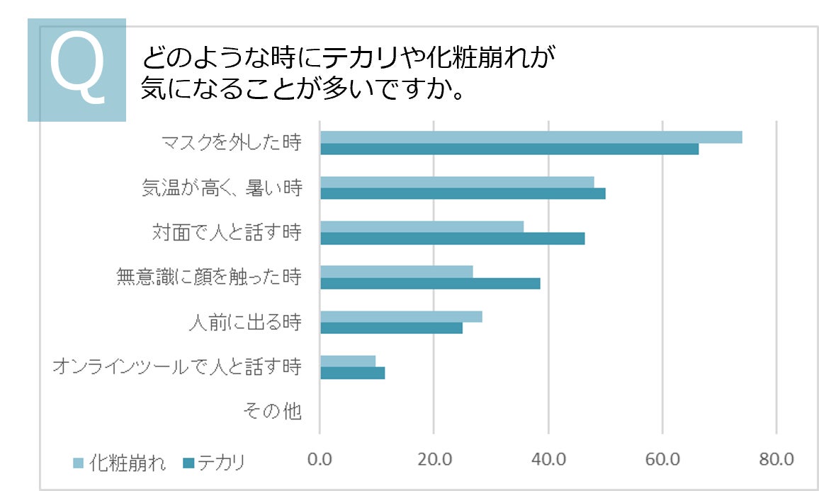 マスク生活が続くコロナ禍(2020年2月~現在)において、テカリが気になると回答した人は35%、化粧崩れが気になる人は30.8%という結果に。マスクをせず、常時顔が見えていたコロナ前と比べても5%以上の変化はなく、マスクをしていてもテカリ・化粧崩れは気になるポイントとなっていることがうかがえます。