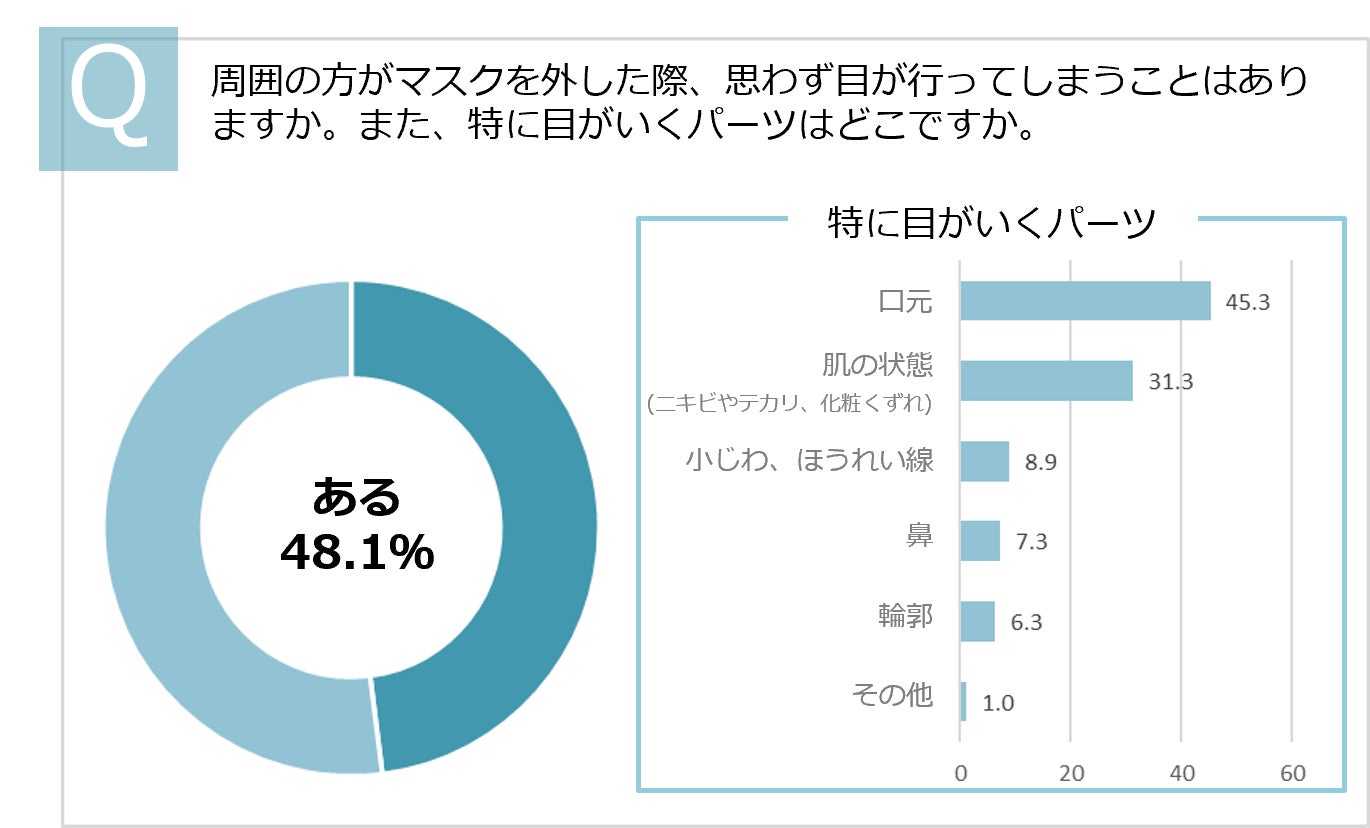そして周囲の人がマスクを外した際に目が行ってしまうことがあると回答した人は48.1%と約半数に上り、そのうちの3割以上の人が「肌の状態に特に目がいく」と、肌状態は周囲の人にとっても気になるポイントとなっていることも分かりました。