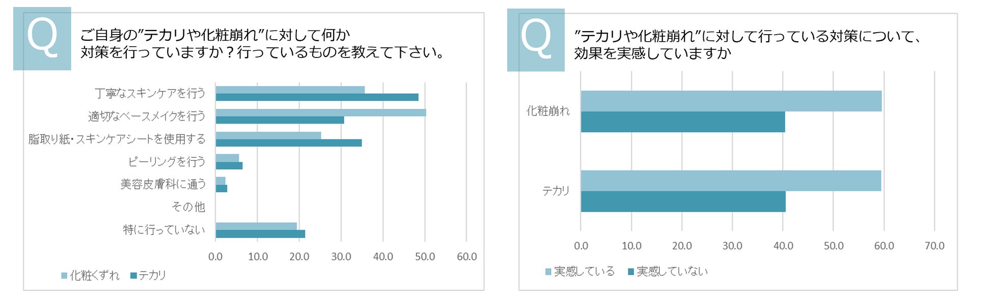 マスク生活でもテカリや化粧崩れが気になると回答した人に何か対策を行っているか聞くと、約8割が何かしら対策を行っていると回答しました。しかしそのうち4割以上がその効果を「感じていない」「あまり感じていない」と回答するなど、現状の対策に満足しておらず、見直しの余地があることが分かりました。