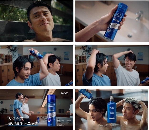 本CMは、原田泰造さんと中村蒼さんが温泉に浸かりながら、リラックスした様子で“お互いの成長”について語るシーンから始まります。髪の成長期を保ち、抜けにくい強い髪を育む「サクセス 薬用育毛トニック」(医薬部外品)をお風呂上がりに使う原田さんと中村さんの表情は必見です。
