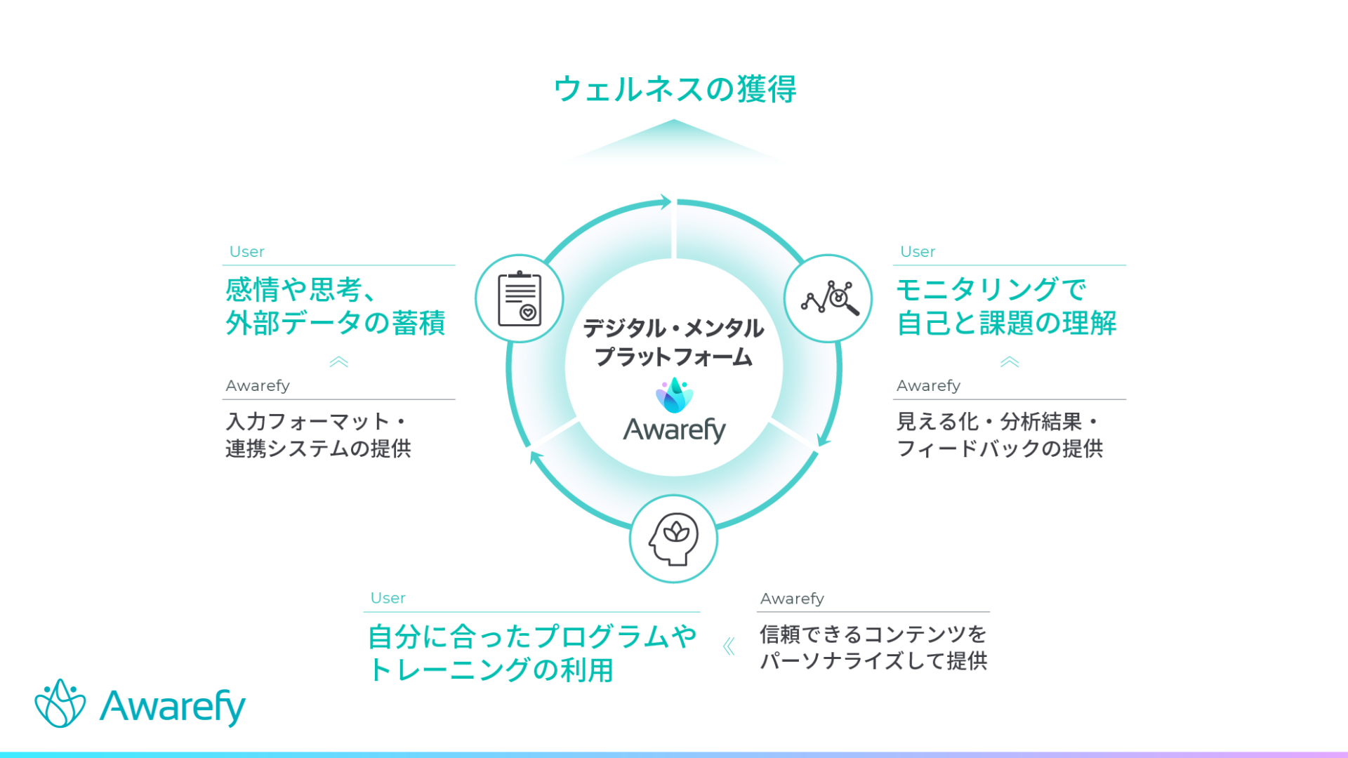 今後、Awarefy を通じてユーザーに価値を提供するべく、アプリの機能拡充にとどまらず、さまざまな事業展開を行ってまいります。