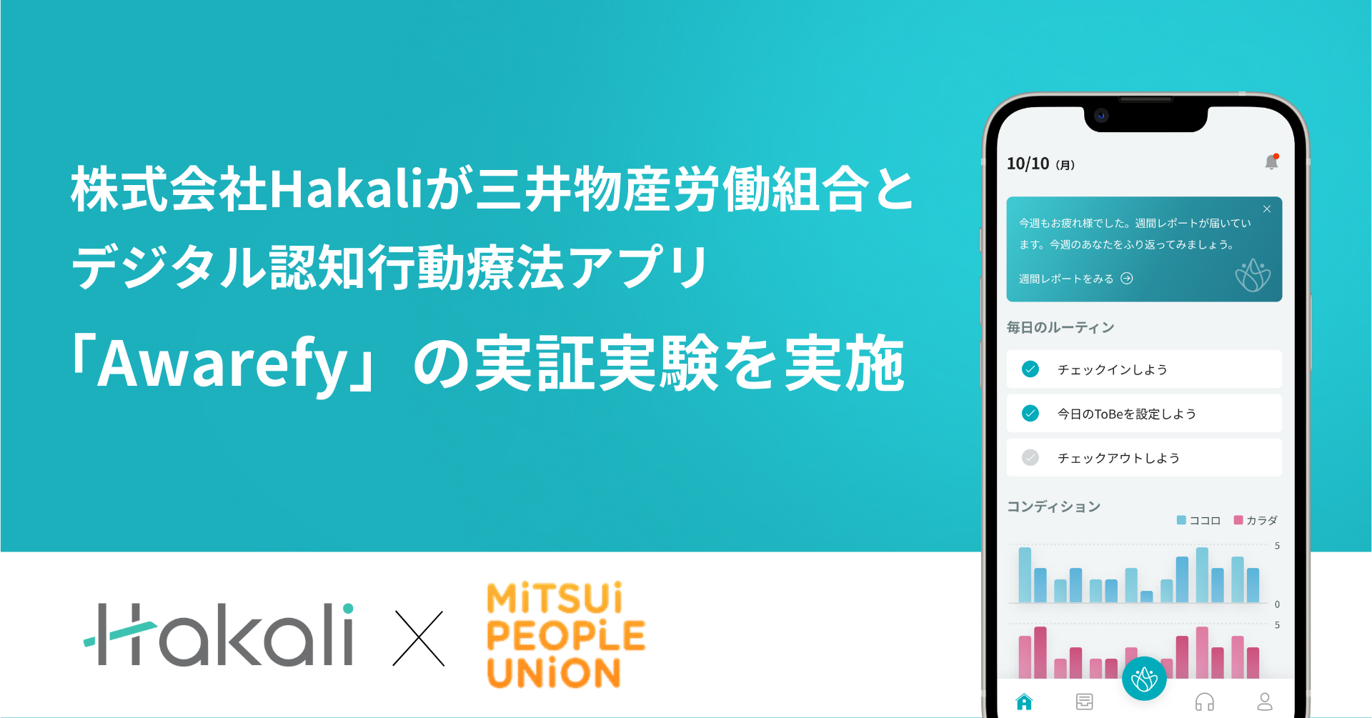 株式会社Hakali(所在地:東京都新宿区、代表取締役社長 小川 晋一郎、以下 Hakali)は、三井物産労働組合(通称:Mitsui People Union)の協力のもと、デジタル認知行動療法アプリ「Awarefy(アウェアファイ)」を用いた実証実験を実施し「ネガティブな気分」「怒り」「疲労」といった項目で一定の改善傾向が見られたことを報告いたします。